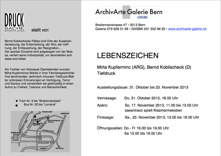 ArchivArte Galerie Bern invites you to the opening reception for LEBENZEICHEN / SIGNS OF LIFE Works by Mirta Kupferminc and Bernd Koblischeck October 31, 2013 - 6 pm Breitenrainstrasse 47 - Bern, Switzerland Exhibition on view through November 23